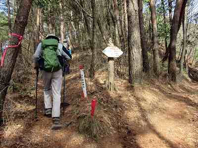 下っていくと、男坂・女坂の分岐がありました。 さてどっちに行くか迷っていたら、女坂を上ってきた方が、こちらの方が花が咲いてますよと いうので女坂を選択します。女坂にはカタクリがあちこちに咲いていました。 やがてブナの分岐という、山ノ神自然園方面への分岐に出ます。 〔男坂・女坂分岐=10:00〕 〔ブナの分岐=10:12〕 |