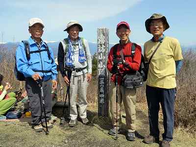 途中の小休憩も含めて1時間05分で山頂まで登ってきました。 狭い山頂ですが、先客やあとから登ってきた人も含めて全部で十数人の登山者で にぎわっていました。 居合わせた方に記念写真を撮ってもらいました。 〔霧訪山山頂 着=9:30〕 |