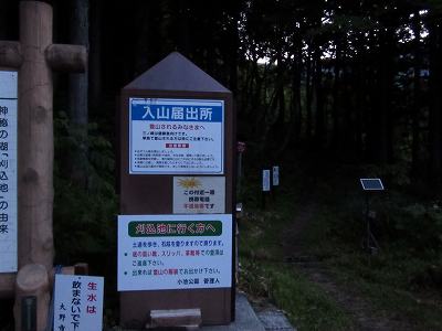 上小池駐車場 早朝4時10分、登山届をポストに投函。 まだ薄暗いのでヘッデンをつけて出発します。 〔上小池駐車場 発=4:10〕 |