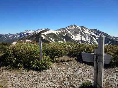 急登はあるものの展望のいい道。そこここに咲くイワカガミなどの花が 気持ちを和ませてくれる道を登ります。 そして第2ベンチ、《三ノ峰へ1.2km》 という標識のところまできました。やれやれです。 右の山が打波ノ頭、その左の雪渓のある山が三ノ峰、さらに左遠くに白山が見えます。 〔第2ベンチ、標識・三ノ峰へ1.2km=7:35~7:40〕 |