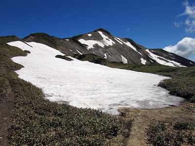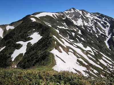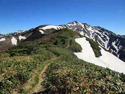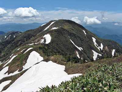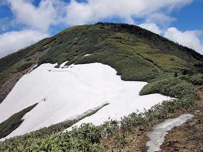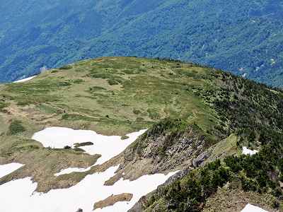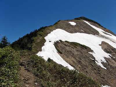 残雪が目立つようになる やがて残雪が目立つようになりました。 とりあえず稜線に夏道がしっかり見えていますが・・・。 |