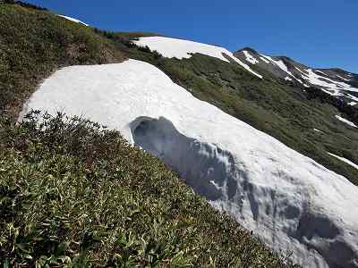 大きな洞穴があいた雪渓 雪渓が登山道のすぐ際まで残っているところがあります。 大きな洞穴があいた雪渓。こういうところには、はまりたくないですねえ。 |