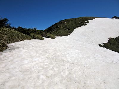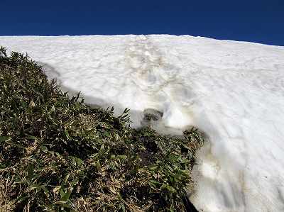 空に向かって登る雪渓 とうとう夏道がなくなりました。 本来の登山道はこの写真の右方向に続くのですが残雪の下です。 左上に向かってトレースがあるので、ここを登れということなのでしょう。 1歩目でずっこけたので、そのあとは慎重にキックステップで空に向かって登りました。 |