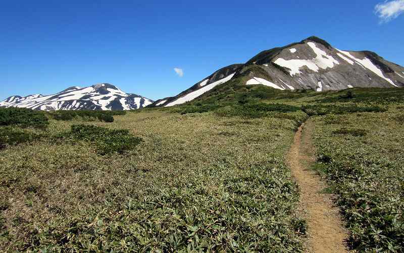 雪原を行く 登りきると雪原でした。 直前に調べた情報で、雪渓歩きが1ヵ所だけあるというのはここですね。 先の方を見ると夏道も見えるので、そこまで雪の上を歩くとします。 明確なトレースはないので、皆さん適当に歩いているのでしょう。 |