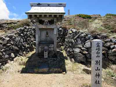 霊峰白山・別山神社 別山山頂の別山神社です。 御手洗池から45分、何とか登りつきました。 社の後に別山の山標が見えています。 |
