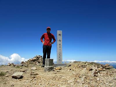 別山山頂(2,399m) 抜けるような青空。 別山山頂をひとり占めして気分は最高! 山頂には二等三角点が設置されていました。 〔別山山頂 着=10:55〕 |