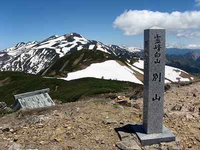 山頂から白山を望む 白山を背に、《霊峰白山 別山》 と彫られた山標が立っています。 その白山は残雪がアゲハチョウのような模様を描いていました。 |