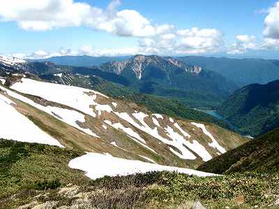 白山の右の景色 白山の右になりますが、写真中央の山は、奥三方岳と三方崩山です。 その右下には大白川ダムの白水湖が見えていました。 |