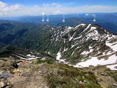 南西側の景色 南西側を見ると銚子ヶ峰、一ノ峰、二ノ峰、そして三ノ峰と続く稜線見えます。 今日は、三ノ峰に登りそこから右へ尾根伝いに別山平を経てここ別山まで登ってきました。 銚子ヶ岳は以前登ったことがあります。 さて、帰りも長い道のりが待っているので別山山頂をあとにします。 〔別山山頂 発=11:25〕 |
