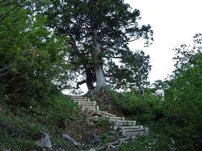 登山口から20分ほど登ったところに山越邸跡というところがあります。 その後、何度か急登のある道を登ること1時間、 ほぼコースタイム通りで六本檜という稜線まで登ってきました。 〔山越邸跡=4:50〕 〔六本檜 着=5:50〕 |