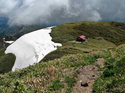 三ノ峰避難小屋 三ノ峰山頂を経て避難小屋まで戻ってきました。 別山山頂からここまで1時間40分、コースタイム通りでした。 ここで小休憩して下ることにします。 〔三ノ峰避難小屋=13:05~13:10〕 |