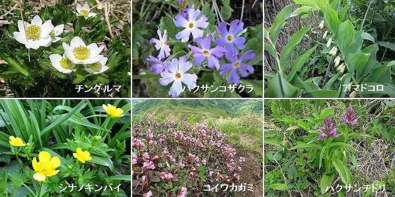 三ノ峰、別山に咲く花 このあとは、花の写真を撮りながら下ります。 三ノ峰も別山も花の山です。7月になれば色とりどりの花が咲きみだれることでしょう。 今は花の少ない時期とはいえ、コイワカガミ、ハクサンコザクラ、シナノキンバイ、アマドコロ、 ツバメオモト、チングルマ、ハクサンチドリ、タニウツギ、ショウジョウバカマ、などなど、 数えきれないほどの花に出会うことができました。 〔おことわり〕 もし、花のなまえに間違いがありましたらお許しください。 |
