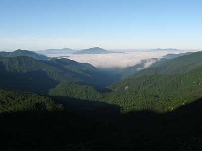 六本檜から振り返ると、雲海の上に荒島岳が浮かんで見えました。 昨年来たときは薄もやがかかっていましたが、今日はいうことなしの晴天です。 小休憩ののち先を急ぎます。 〔六本檜 発=6:00〕 |