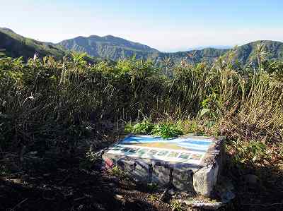 気持ちのいい尾根歩きですが、やがて前方にごつごつした剣ヶ岩が見えてくると 急登となります。 剣ヶ岩を左から巻くように岩場の道を登ってきました。 山座同定と花の写真が カラフルな案内板があります。 〔剣ヶ岩=6:50~6:55〕 |