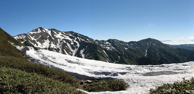急登ではないもののようやく別山平まで登ってきました。 別山平は気持ちのいい笹の原っぱです。 正面に別山、左奥に白山。いいですねえ。 |