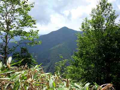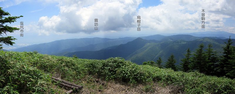 林の中を登るので直射日光は避けられます。 ところどころで東側が開け、烏帽子岳(1,952m)や塩尻方面が見えていました。 |