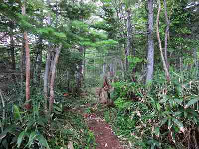 村界尾根からは緩やかな稜線の道になります。 登山道わきにはゴゼンタチバナの白い花がたくさん咲いていました。 |