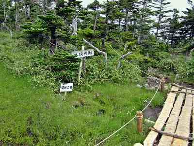 権現の庭 途中でわれわれより先に登っていった女性に出会い、立ち話をしました。。 速いですねえ、もう降りてこられたんですか、というと、山頂は虫が多くてゆっくりできなかったそうです。 さらに登っていくと木道が架けられていました。あたりは湿地帯でワタスゲなどの花が咲いています。 見回すと自然の日本庭園のような感じのところでした。権現の庭というそうです。 〔権現の庭=11:40〕 |