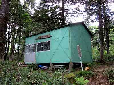 モミジカラマツが群れて咲く中を登ってくると避難小屋の鉢盛山荘に出ます。この小屋は緊急の場合のみ利用してほしいそうです。 〔鉢盛山荘(避難小屋)=11:45〕 |