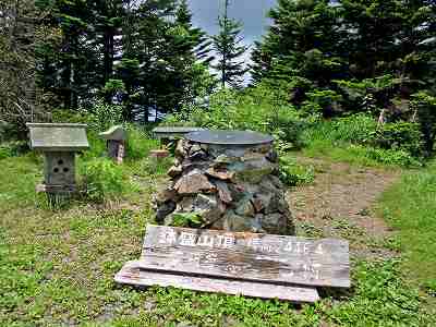 鉢盛山山頂(2,447m) 鉢盛山荘から5分で鉢盛山山頂に到着しました。 一等三角点と方位盤があり、3つの祠が祀られていました。 この山頂は、朝日村、木祖村、波田町(現、 松本市波田)の境界になっているので、それぞれの村の祠かもしれません。 〔鉢盛山山頂 着=11:50〕 |