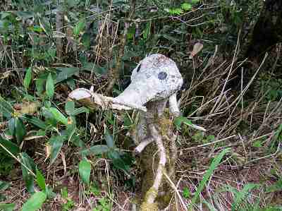 象さん? 山頂は展望が開けないので、100mほど奥の反射板展望広場へ行くことにしました。 その途中でこんなものを見つけました。象さんでしょうか。 ご丁寧に目玉が描きこんであります。 |