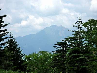 御嶽山(3,063m) 御嶽山の山姿はあちこちから見ているのですぐわかりました。 とはいえ山頂部分は雲の中です。 |