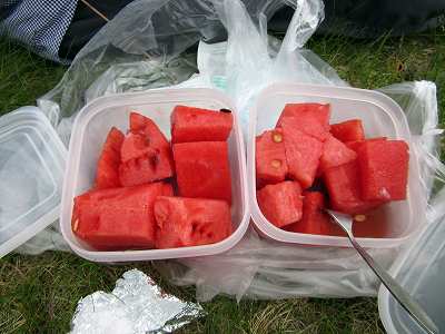 涼しい山頂広場で冷たいスイカ 眺望はいまひとつでしたが、標高2400mあまりの山頂は別天地です。 浜松のOさんが冷やしたスイカを持ってきてくれました。 自家製スイカで、甘くて冷たいデザートは最高です。 ブヨなどのむしは虫よけスプレー効果で大丈夫でした。 |