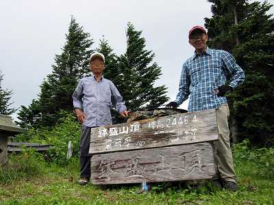 鉢盛山山頂で記念写真 酷暑とは無縁の山頂で、1時間以上も長居してしまいました。 遠くまで帰らなければならないので、山頂で登頂記念の写真を撮って下山します。 〔鉢盛山山頂 発=13:00〕 |