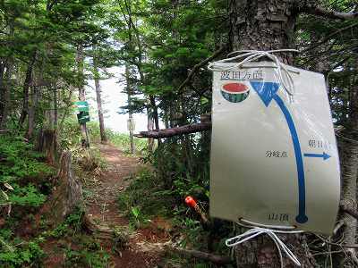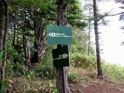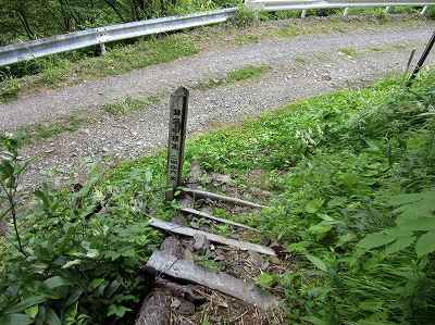 旧登山道口 村界尾根から10分ほどのところに案内標識がありました。 たぶんこれが旧登山道口の分岐でしょう。 〔旧登山道口=10:50〕 |