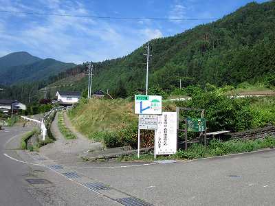 鉢盛山新登山口は、カーナビにセットしても道路がわからないということで案内してくれません。 行き方ですが、役場の前の道をそのまま7・8分進んで行くと、写真のように案内板が立っています。 指示にしたがい、ここを右折して進みます。 |