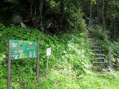 駐車場からちょっとだけ戻ったところが登山口です。 概略図が描かれた案内板もあります。 〔新登山口 発=9:05〕 |