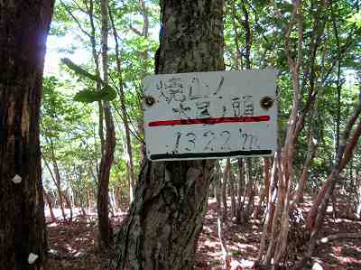 焼山ノ太尾ノ頭(1,322m) 焼山ノ太尾ノ頭は思った通りすぐのところにありました。 消えかけた手づくりの山標があるだけで、ほかには何もないピークでした。 〔焼山ノ太尾ノ頭=9:35〕 |