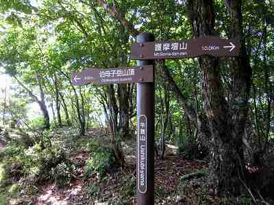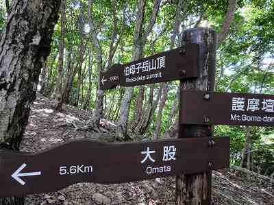 大股分岐 北に位置する大股というところから小辺路を歩いてくるコースへの分岐まで来ました。 伯母子岳へは分岐を右にとります。ここまでずっと遊歩道を歩いてきましたが山道に 変わり、距離はあと600mだそうです。 〔大股分岐=11:25〕 |