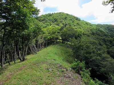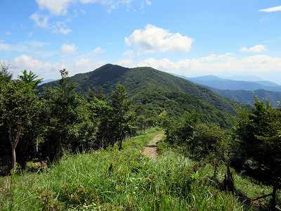 牛首山から見た牛首ノ峰 牛首山からは東側が開けていました。 前方に見える山が一瞬伯母子岳かと思いましたが違いました。 ここで行程のちょうど半分なので、見えているのは牛首ノ峰です。 伯母子岳は牛首ノ峰の陰に隠れて見えません。 小休憩して出発します。 〔牛首山 発=9:50〕 |