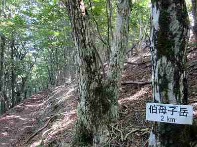 林道がいい道だったので思ったより早く登山口に到着。 この登山口付近の路肩に4台ほどの駐車スペースがあります。 さて、伯母子岳へ向けて出発です。伯母子岳まで5.6kmと表示されていました。 〔奥千丈林道登山口 発=8:30〕 |