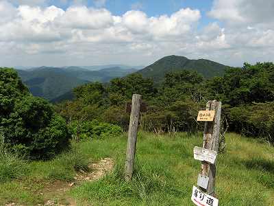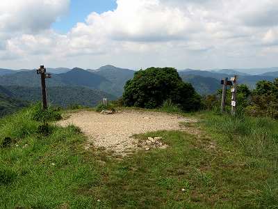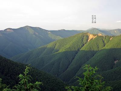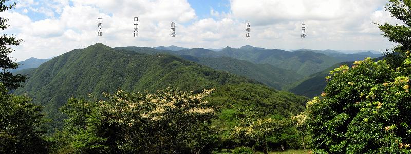 歩いてきた西側稜線のパノラマ ここまで歩いてきた稜線のパノラマです。 明確にはいえませんが、ちょうど写真の中央部の登山口から口千丈山、牛首ノ峰を経て稜線伝いに歩いてきた ことになります。 また、中央奥に護摩壇山の龍神岳が確認できました。よく見ると通信用鉄塔が見えたのです。 〔注〕正確にいうと、この写真は、山頂から少し下がったところから撮影したものです。 Please permit it if mention of the name of the mountain includes an error. |