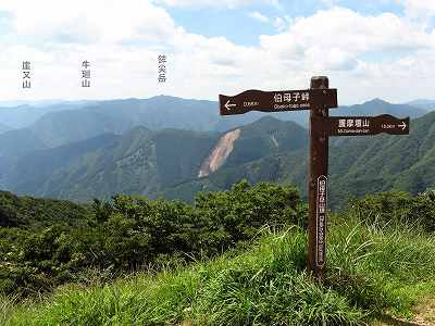 南側の山 最後に南側の山です。 このあたりの山になるとなじみがありませんね。 鉾尖岳(ほこさきだけ 1,319m)、牛廻山(うしまわしやま 1,207m)、 崖又山(がけまたやま 1,205m)などです。 Please permit it if mention of the name of the mountain includes an error. さて、眺望を十分楽しんだので下山することにします。 〔伯母子岳山頂 発=11:10〕 |