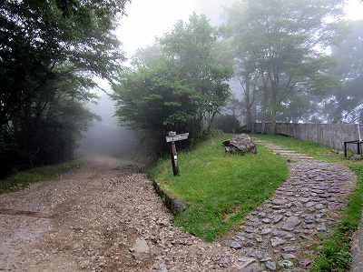 昨夜は星空だったのに、朝起きたらあたり一面霧の中でした。 ちょっとテンションが下がります。 しかし、護摩壇山のあと伯母子岳にも行かなければならないので出発することにしました。 駐車場の南にある売店・レストラン棟の裏が登山道入り口で右へ登って行きます。 〔道の駅・ごまさんスカイタワー駐車場登山口 発=6:45〕 |