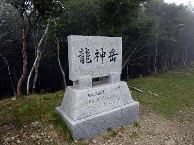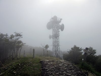 立派な山頂標識がありました。 基部に『和歌山県最高峰1,382m』と彫られています。 わが愛知県の最高峰は茶臼山で、たいして高くはありませんが1,415mなので 和歌山県には勝ったようです。 霧で何も見えないので帰ります。 〔龍神岳山頂=7:20~7:25〕 |