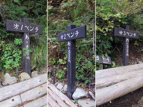 第1・第2・第3ベンチ 水場から先が大変でした。 ここまでくると疲れて足が進みません。 30歩・50歩登っては休みを繰り返して登ります。 第2ベンチで小休憩することにしました。 〔第1ベンチ=12:45〕 〔第2ベンチ=13:05~13:10〕 〔第3ベンチ=13:20〕 |