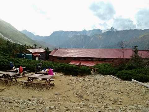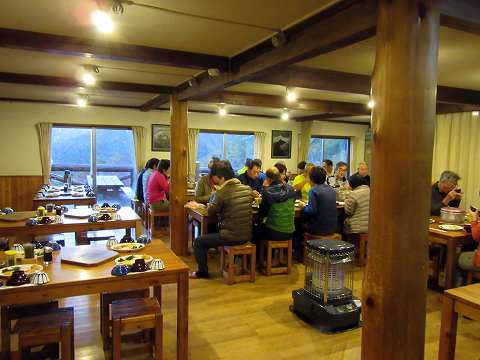 常念小屋 朝食風景 シルバーウィークが過ぎた平日だったので小屋はすいていました。 6人部屋に4人でしたからゆっくりと夜を過ごさせてもらいました。 そして早朝5時半から朝食をとって出発します。 |