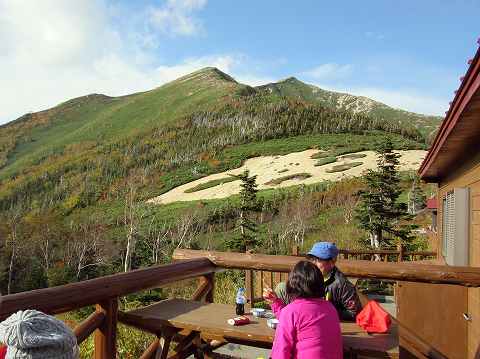 常念小屋のテラスから見た横通岳(右奥) しっかり疲れたので、到着してすぐ常念小屋にチェックインし、のんびり過ごすことにしました。 小屋の西側にある展望テラスは陽があたって暖かでした。 ここで槍ヶ岳や横通岳(よこどおしだけ)を眺めながらビールを飲むという幸せな時間を過ごします。 |