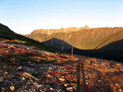 槍ヶ岳と影常念 今日も朝から快晴。朝日を受けて赤みがかった槍ヶ岳が望めます。 そして 『影常念』。ふもとから見た形そのままの三角形をした常念岳の影が山に映し出されていました。 |