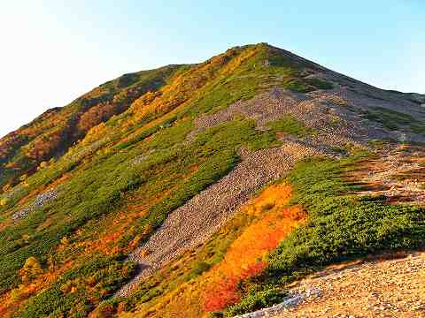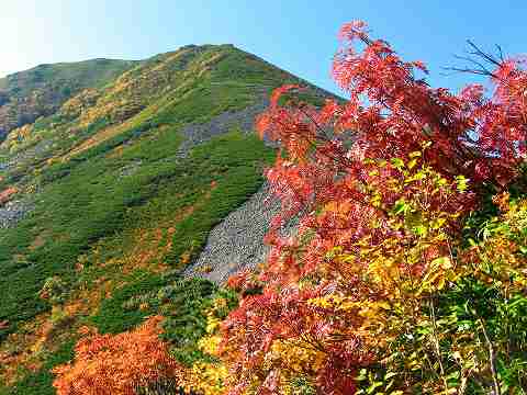 紅葉がまぶしい常念岳の山腹 高い所ではもう紅葉が始まっていました。 常念乗越からは常念岳の山頂は見えません。 見えているのは前衛のピークで、 左奥の方が前常念だと思われます。 さあ、常念へ登るぞー! 〔常念小屋・常念乗越 発=6:05〕 |