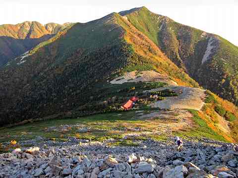 常念乗越を下る 常念山頂から下ってくる途中で昨日出会った新潟のご夫婦に再会。 好天の絶景眺望をお互いに喜び合い、エールを交換して別れました。 そのあと山ガールさんと楽しいおしゃべりをしながら下ってきました。 常念小屋にデポしておいたザックを引き取り下山にかかります。 〔常念小屋・常念乗越=8:45~8:55〕 |