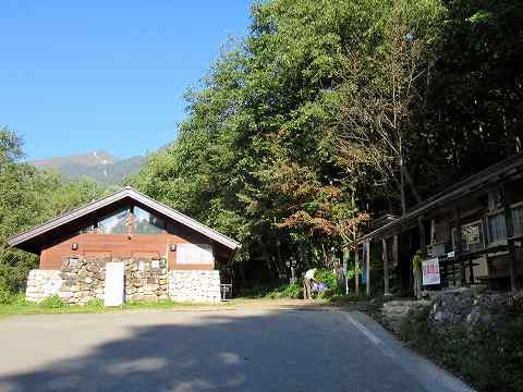 出発して25分弱で一ノ沢登山口に着きました。 正面のトイレの建物の奥に見える山は方向から判断すると横通岳あたりではないでしょうか。 そして右側の建物が登山指導所で、ご夫婦連れが登山届を書いているところでした。 私は前日に長野県のホームページから登山計画の電子申請を 済ませています。 〔一ノ沢登山口=8:10~8:15〕 |