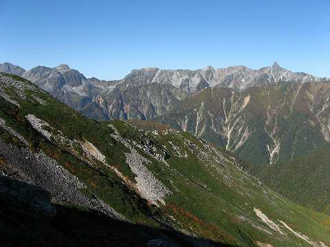 常念岳が姿を現わす 前衛のピークまで登ってきました。 ここまできてようやく常念岳の山頂部を見ることができました。 昨日出発してから初めてです。 |