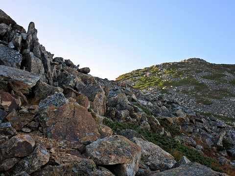 三股分岐 前衛ピークからは少し緩やかにはなりますが岩ゴロの道が続きます。 そして三股分岐まで登ってきました。前常念から三股登山口への分岐です。 なお、この写真は北側を振り返って撮ったものです。 〔三股分岐=7:10〕 |