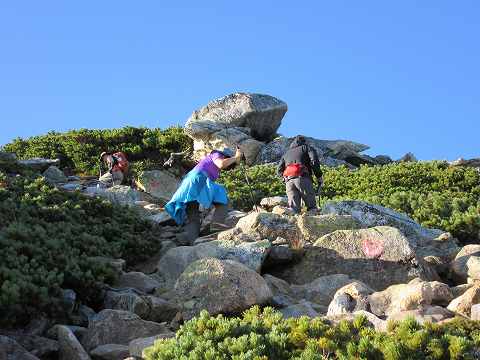 最後の登り あと少し、前方の岩を左から回り込んで登れば常念岳の山頂です。 |