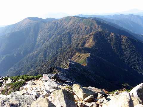 蝶ヶ岳・大滝山へ続く稜線 早朝の山頂からの眺望は1日のうちでも抜群です。 まずは南側。 蝶ヶ岳への縦走路がきれいに見えています。 54年前に上高地から蝶ヶ岳に登りましたが初雪が降って常念岳への縦走をあきらめた ことを思い出しました。 このあと南から時計まわりに展望を紹介します。 |